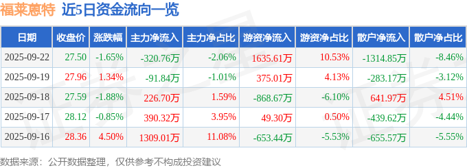 证券之星消息,截至2025年9月22日收盘,福莱蒽特(605566)报收于27.5元,下跌1.65%,换手率4.31%,成交量5.75万手,成交额1.55亿元。