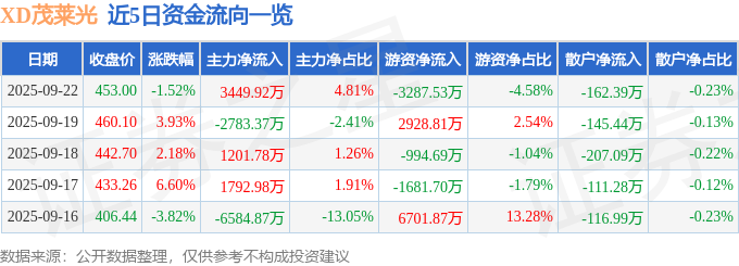 证券之星消息,截至2025年9月22日收盘,XD茂莱光(688502)报收于453.0元,下跌1.52%,换手率9.63%,成交量1.62万手,成交额7.17亿元。