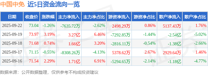 证券之星消息,截至2025年9月22日收盘,中国中免(601888)报收于73.04元,下跌1.26%,换手率2.05%,成交量39.94万手,成交额29.16亿元。