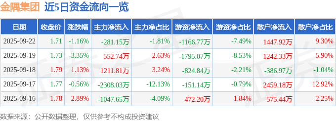 证券之星消息,截至2025年9月22日收盘,金隅集团(601992)报收于1.71元,下跌1.16%,换手率1.1%,成交量91.85万手,成交额1.56亿元。