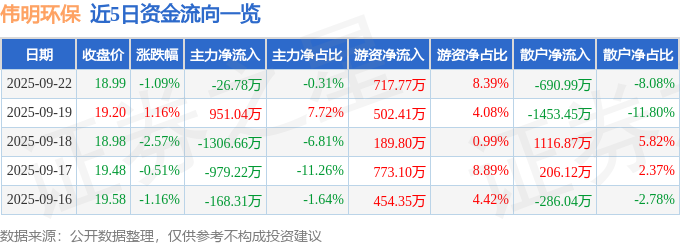 证券之星消息,截至2025年9月22日收盘,伟明环保(603568)报收于18.99元,下跌1.09%,换手率0.27%,成交量4.51万手,成交额8550.17万元。
