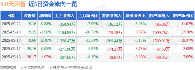 证券之星消息,截至2025年9月22日收盘,XD天元智(603273)报收于19.16元,下跌0.88%,换手率4.19%,成交量2.35万手,成交额4491.68万元。