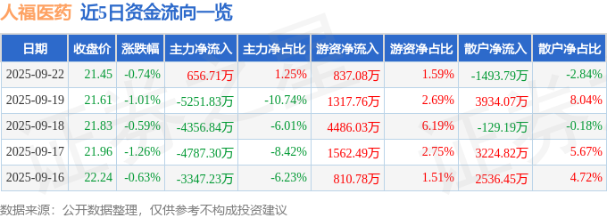 证券之星消息,截至2025年9月22日收盘,人福医药(600079)报收于21.45元,下跌0.74%,换手率1.58%,成交量24.43万手,成交额5.27亿元。