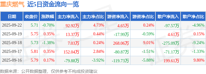 证券之星消息,截至2025年9月22日收盘,重庆燃气(600917)报收于5.71元,下跌0.7%,换手率0.22%,成交量3.44万手,成交额1965.52万元。
