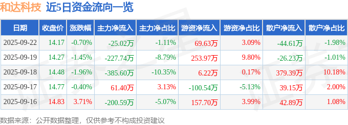 9月22日的资金流向数据方面,主力资金净流出25.02万元,占总成交额1.11%,游资资金净流入69.63万元,占总成交额3.09%,散户资金净流出44.61万元,占总成交额1.98%。