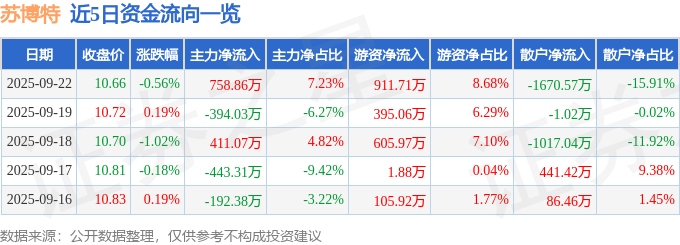 证券之星消息,截至2025年9月22日收盘,苏博特(603916)报收于10.66元,下跌0.56%,换手率2.34%,成交量9.83万手,成交额1.05亿元。