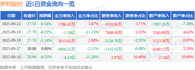 证券之星消息,截至2025年9月22日收盘,伊利股份(600887)报收于27.55元,下跌0.54%,换手率0.62%,成交量38.87万手,成交额10.7亿元。