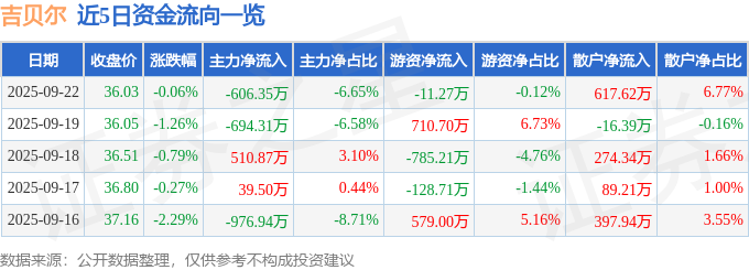 9月22日的资金流向数据方面,主力资金净流出606.35万元,占总成交额6.65%,游资资金净流出11.27万元,占总成交额0.12%,散户资金净流入617.62万元,占总成交额6.77%。