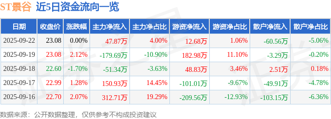 证券之星消息,截至2025年9月22日收盘,ST景谷(600265)报收于23.08元,上涨0.0%,换手率0.4%,成交量5228.0手,成交额1197.51万元。
