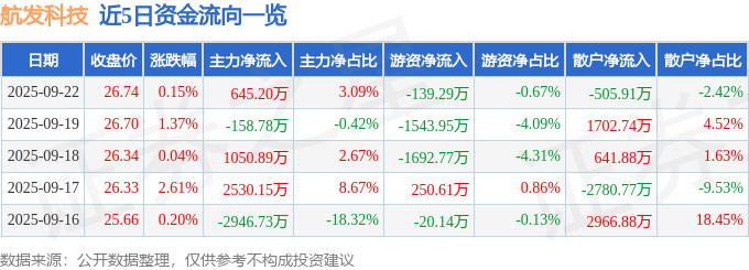 9月22日的资金流向数据方面,主力资金净流入645.2万元,占总成交额3.09%,游资资金净流出139.29万元,占总成交额0.67%,散户资金净流出505.91万元,占总成交额2.42%。