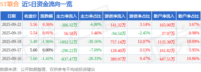 证券之星消息,截至2025年9月22日收盘,ST联合(600358)报收于5.56元,上涨0.36%,换手率1.59%,成交量8.03万手,成交额4501.85万元。