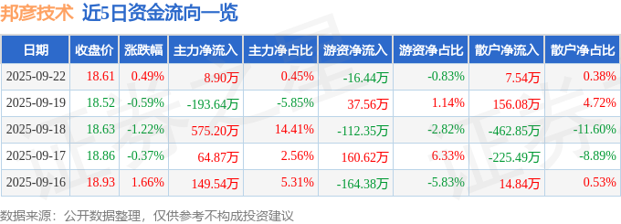 证券之星消息,截至2025年9月22日收盘,邦彦技术(688132)报收于18.61元,上涨0.49%,换手率0.99%,成交量1.07万手,成交额1986.51万元。
