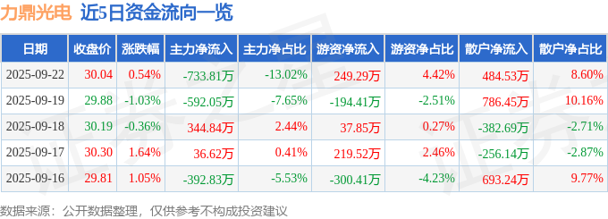 证券之星消息,截至2025年9月22日收盘,力鼎光电(605118)报收于30.04元,上涨0.54%,换手率0.46%,成交量1.88万手,成交额5635.96万元。