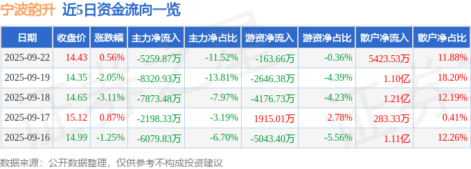 9月22日的资金流向数据方面,主力资金净流出5259.87万元,占总成交额11.52%,游资资金净流出163.66万元,占总成交额0.36%,散户资金净流入5423.53万元,占总成交额11.88%。