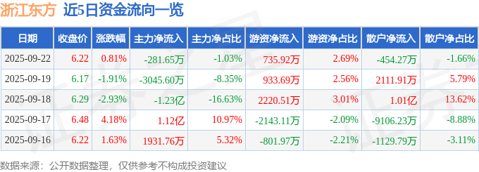 证券之星消息,截至2025年9月22日收盘,浙江东方(600120)报收于6.22元,上涨0.81%,换手率1.29%,成交量44.04万手,成交额2.73亿元。