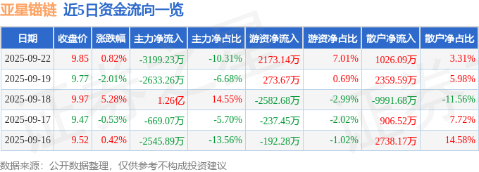 证券之星消息,截至2025年9月22日收盘,亚星锚链(601890)报收于9.85元,上涨0.82%,换手率3.28%,成交量31.5万手,成交额3.1亿元。