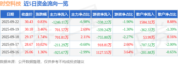 证券之星消息,截至2025年9月22日收盘,时空科技(605178)报收于30.43元,上涨0.83%,换手率5.94%,成交量5.89万手,成交额1.78亿元。