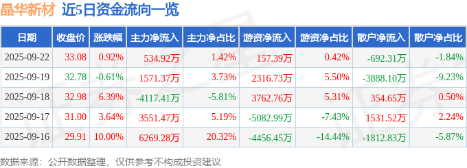 证券之星消息,截至2025年9月22日收盘,晶华新材(603683)报收于33.08元,上涨0.92%,换手率4.48%,成交量11.58万手,成交额3.76亿元。
