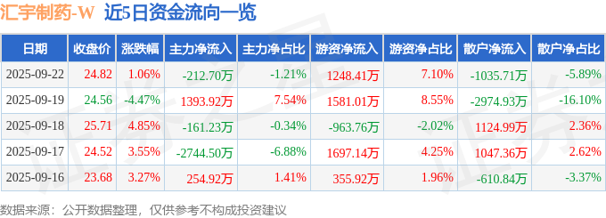 证券之星消息,截至2025年9月22日收盘,汇宇制药(688553)报收于24.82元,上涨1.06%,换手率2.05%,成交量7.05万手,成交额1.76亿元。