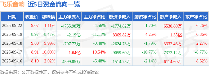 证券之星消息,截至2025年9月22日收盘,飞乐音响(600651)报收于9.07元,上涨1.11%,换手率4.62%,成交量115.77万手,成交额10.43亿元。