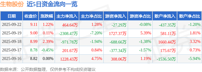 证券之星消息,截至2025年9月22日收盘,生物股份(600201)报收于9.11元,上涨1.22%,换手率3.57%,成交量39.68万手,成交额3.64亿元。