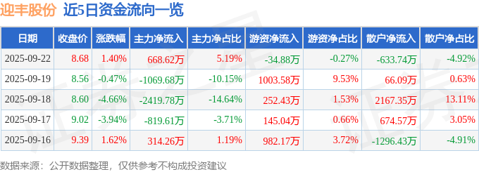 证券之星消息,截至2025年9月22日收盘,迎丰股份(605055)报收于8.68元,上涨1.4%,换手率3.35%,成交量14.75万手,成交额1.29亿元。