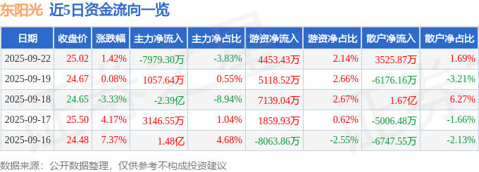 证券之星消息,截至2025年9月22日收盘,东阳光(600673)报收于25.02元,上涨1.42%,换手率2.82%,成交量84.55万手,成交额20.85亿元。