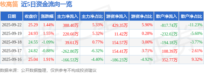 证券之星消息,截至2025年9月22日收盘,牧高笛(603908)报收于25.29元,上涨1.44%,换手率3.09%,成交量2.89万手,成交额7280.77万元。