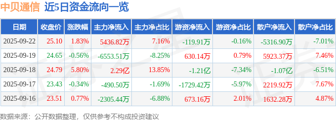 证券之星消息,截至2025年9月22日收盘,中贝通信(603220)报收于25.1元,上涨1.83%,换手率7.0%,成交量30.41万手,成交额7.59亿元。