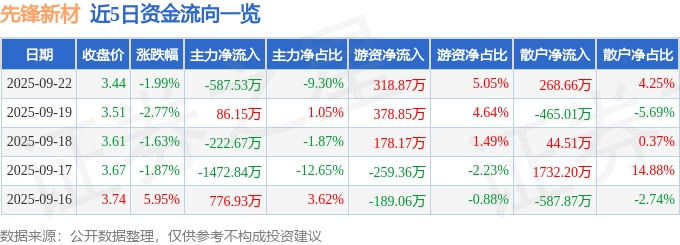 证券之星消息,截至2025年9月22日收盘,先锋新材(300163)报收于3.44元,下跌1.99%,换手率4.04%,成交量18.32万手,成交额6315.12万元。