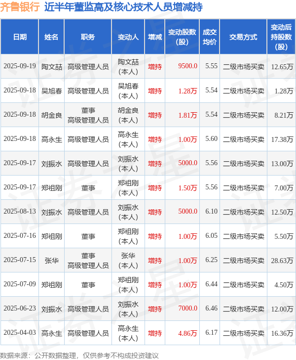 齐鲁银行近半年内的董监高及核心技术人员增减持详情如下: