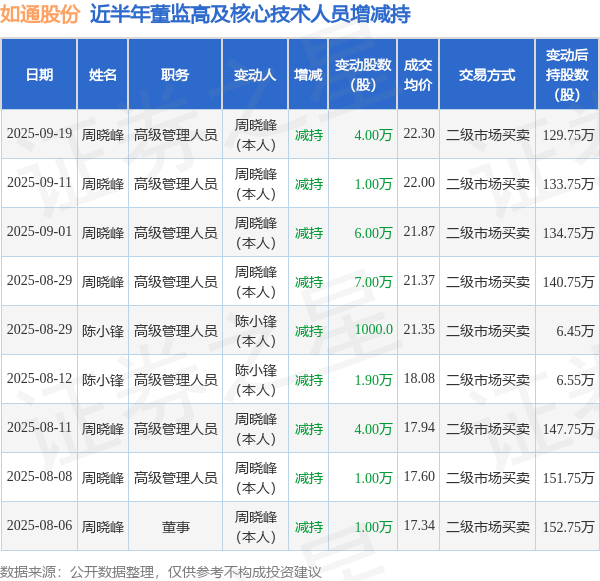 如通股份近半年内的董监高及核心技术人员增减持详情如下: