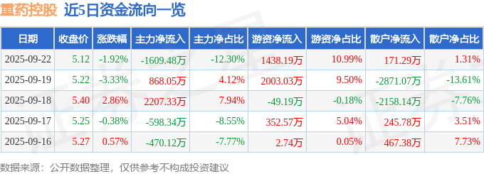 证券之星消息,截至2025年9月22日收盘,重药控股(000950)报收于5.12元,下跌1.92%,换手率1.47%,成交量25.43万手,成交额1.31亿元。