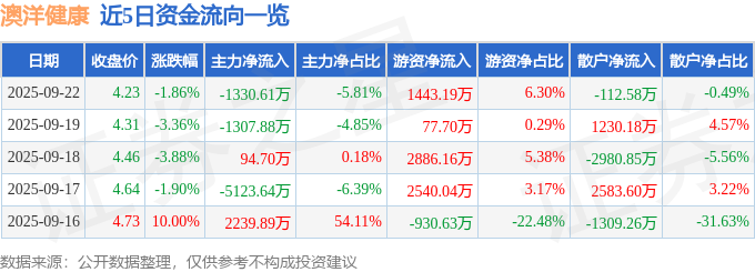 证券之星消息,截至2025年9月22日收盘,澳洋健康(002172)报收于4.23元,下跌1.86%,换手率6.97%,成交量53.36万手,成交额2.29亿元。