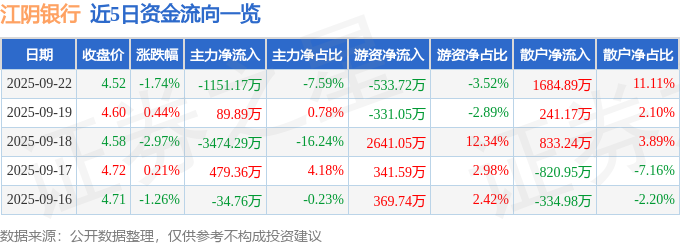 证券之星消息,截至2025年9月22日收盘,江阴银行(002807)报收于4.52元,下跌1.74%,换手率1.36%,成交量33.43万手,成交额1.52亿元。