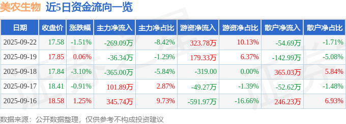 证券之星消息,截至2025年9月22日收盘,美农生物(301156)报收于17.58元,下跌1.51%,换手率2.44%,成交量1.82万手,成交额3195.35万元。