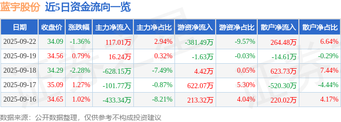 9月22日的资金流向数据方面,主力资金净流入117.01万元,占总成交额2.94%,游资资金净流出381.49万元,占总成交额9.57%,散户资金净流入264.48万元,占总成交额6.64%。