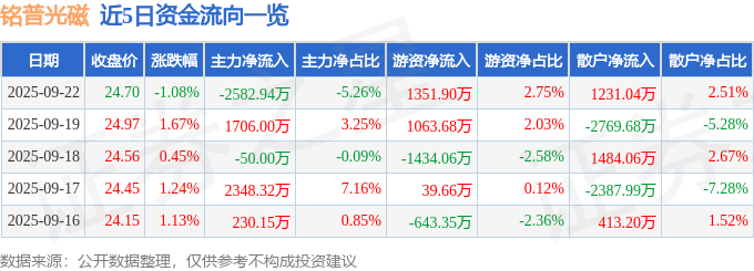 证券之星消息,截至2025年9月22日收盘,铭普光磁(002902)报收于24.7元,下跌1.08%,换手率11.21%,成交量19.92万手,成交额4.91亿元。