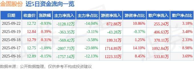 证券之星消息,截至2025年9月22日收盘,金固股份(002488)报收于12.72元,下跌0.93%,换手率0.68%,成交量6.29万手,成交额8037.38万元。