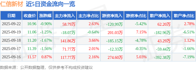 证券之星消息,截至2025年9月22日收盘,仁信新材(301395)报收于10.96元,下跌0.9%,换手率1.58%,成交量2.04万手,成交额2233.88万元。