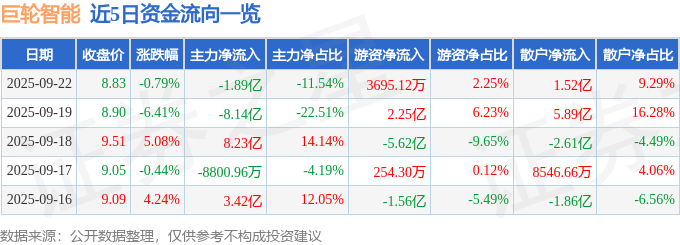证券之星消息,截至2025年9月22日收盘,巨轮智能(002031)报收于8.83元,下跌0.79%,换手率9.55%,成交量185.06万手,成交额16.4亿元。