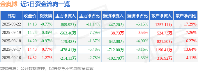 证券之星消息,截至2025年9月22日收盘,金奥博(002917)报收于14.13元,下跌0.77%,换手率1.98%,成交量5.16万手,成交额7270.05万元。
