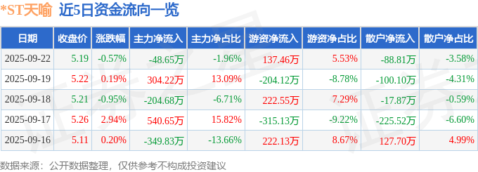 证券之星消息,截至2025年9月22日收盘,*ST天喻(300205)报收于5.19元,下跌0.57%,换手率1.11%,成交量4.76万手,成交额2483.97万元。