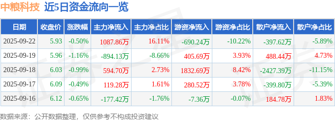 证券之星消息,截至2025年9月22日收盘,中粮科技(000930)报收于5.93元,下跌0.5%,换手率0.61%,成交量11.4万手,成交额6752.87万元。