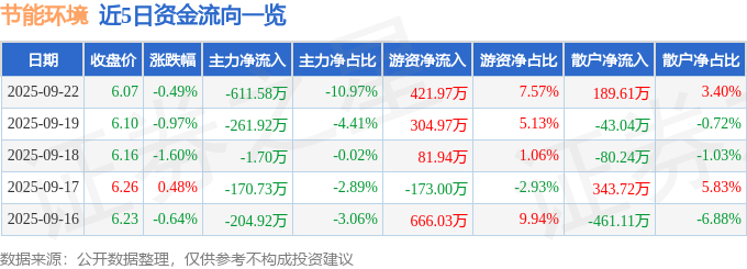 证券之星消息,截至2025年9月22日收盘,节能环境(300140)报收于6.07元,下跌0.49%,换手率0.9%,成交量9.23万手,成交额5574.11万元。