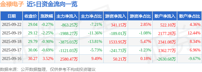 证券之星消息,截至2025年9月22日收盘,金禄电子(301282)报收于29.04元,下跌0.27%,换手率5.19%,成交量4.13万手,成交额1.2亿元。