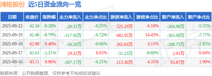 证券之星消息,截至2025年9月22日收盘,鸿铭股份(301105)报收于42.34元,下跌0.28%,换手率5.28%,成交量8684.0手,成交额3695.13万元。