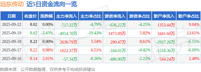 证券之星消息,截至2025年9月22日收盘,远东传动(002406)报收于8.02元,上涨0.0%,换手率3.1%,成交量18.69万手,成交额1.5亿元。