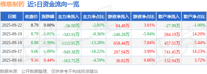 证券之星消息,截至2025年9月22日收盘,佛慈制药(002644)报收于8.79元,上涨0.0%,换手率0.63%,成交量3.2万手,成交额2809.76万元。