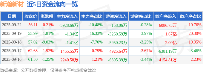 证券之星消息,截至2025年9月22日收盘,新瀚新材(301076)报收于56.11元,上涨0.21%,换手率9.17%,成交量10.07万手,成交额5.66亿元。
